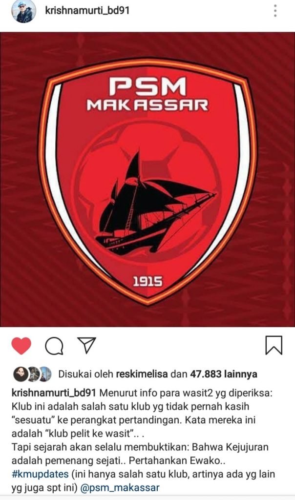 Klub ini (PSM Makassar) adalah salah satu klub yg tidak pernah kasih “sesuatu” ke perangkat pertandingan. Kata mereka ini adalah “klub pelit ke wasit”,” ungkap Krishna, Kamis (21/2/2019).