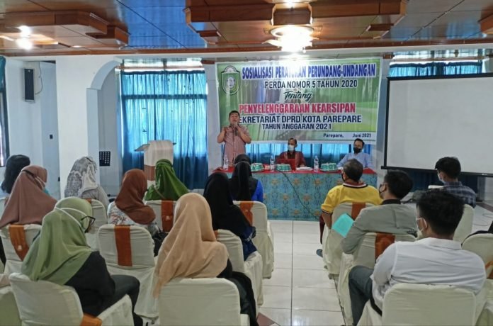 PAREPARE, SULSELEKSPRES.COM – Ketua Komisi I DPRD Kota Parepare, Kaharuddin Kadir menyosialisasikan Peraturan Perundang-undangan Peraturan Daerah (Perda) Nomor 5 Tahun 2020, tentang Penyelenggaraan Kearsipan, di Hotel Satria Parepare, Minggu (13/06/2021).