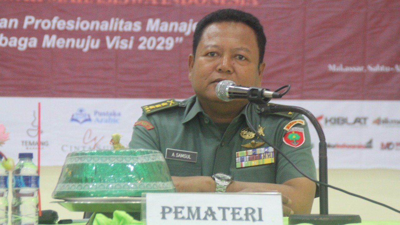 Kolonel A. Syamsul, Staff ahli Pangdam XIV/ Hasanuddin saat membawakan materi di sela persidangan Musyawarah Kerja Nasional (Mukernas) II LIDMI, di Balai Latihan Masyarakat Kemendes Makassar, Minggu (29/4/2018).