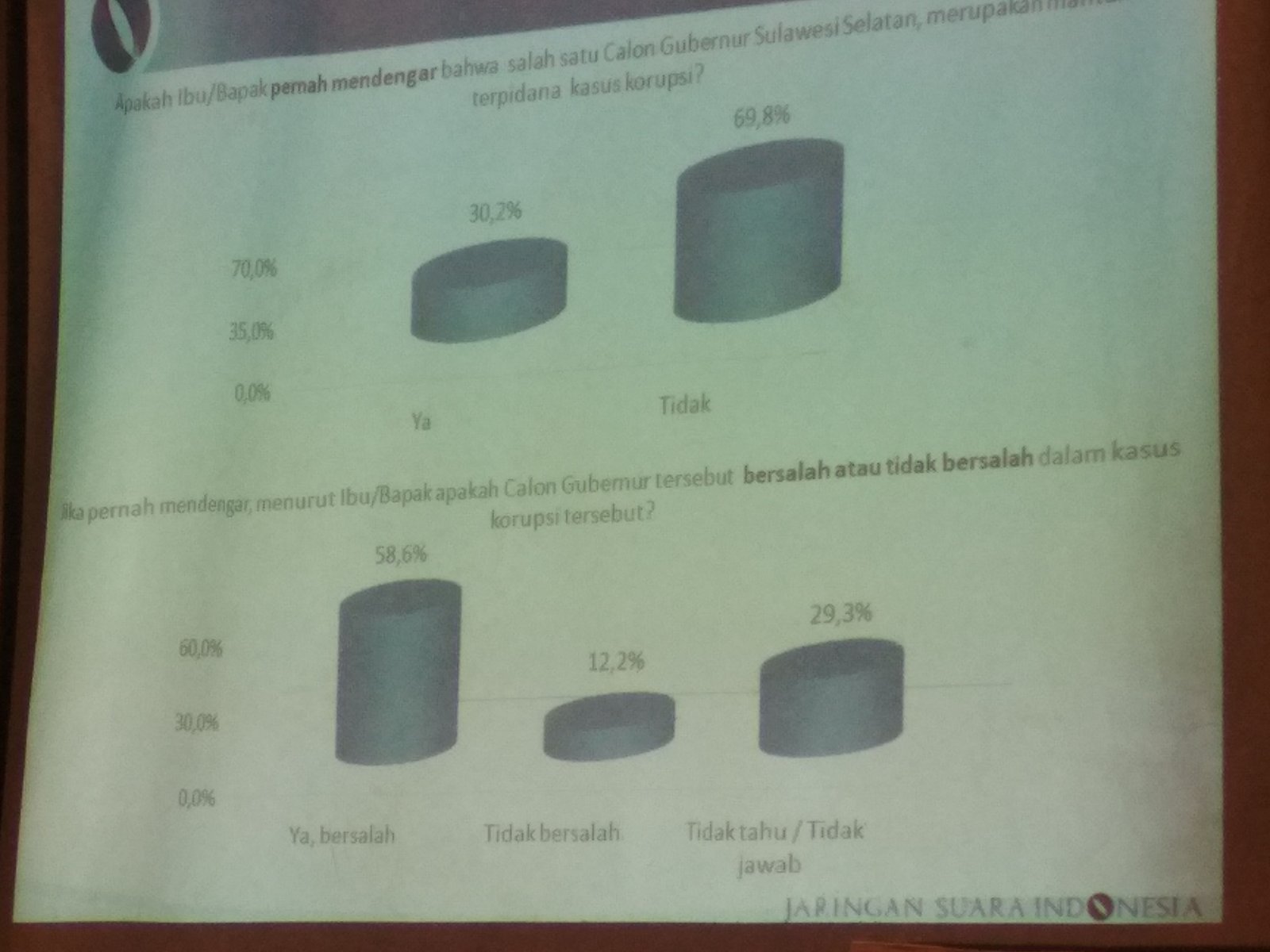 Hasil survei JSI yang mengunakan 1.200 sampel dari 24 kabupaten kota se Sulsel, dengan kira – kira 2.9 persen mergin eror.