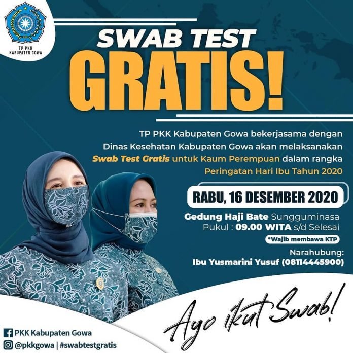 GOWA, SULSELEKSPRES.COM – Tim Penggerak Pemberdayaan dan Kesejahteraan Keluarga (TP-PKK) Kabupaten Gowa bekerjasama dengan Dinas Kesehatan Kabupaten Gowa akan menggelar Swab Test Gratis pada Rabu (16/12/2020) mendatang.