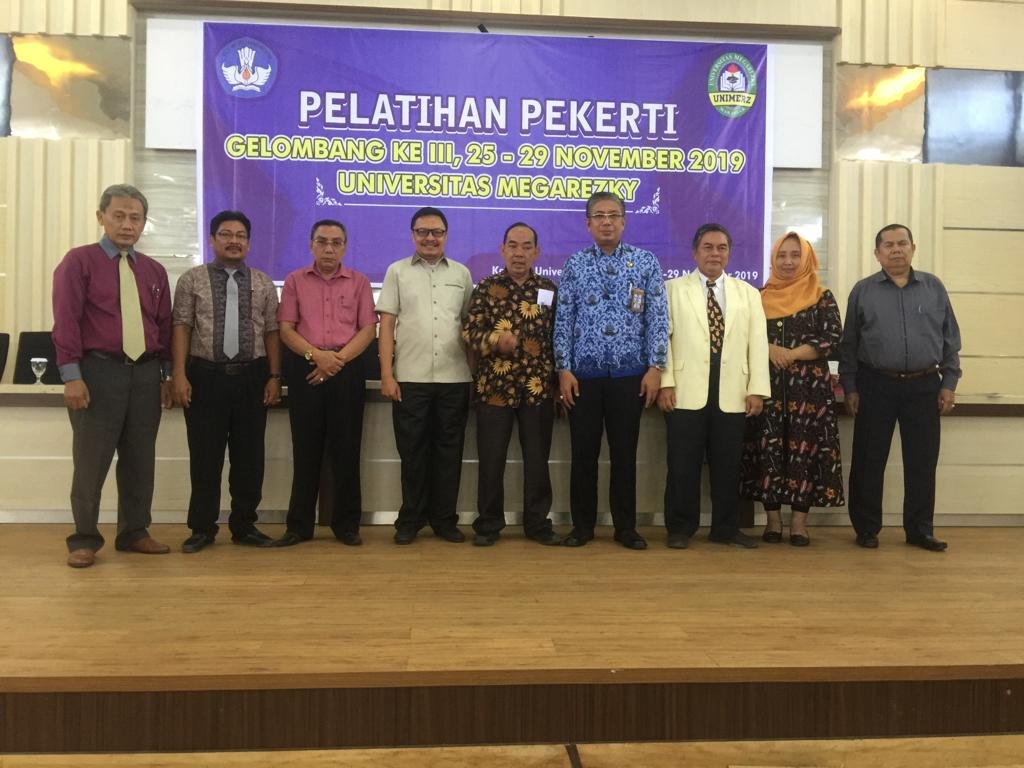 Ketua Pelatihan Pekerti Prof Dr. A. Muin Fahmal, S.H.,M.H , Sekretaris Prof. Dr. Ansar, SE, M.Si serta sejumlah pejabat tinggi Unimerz lainnya.
